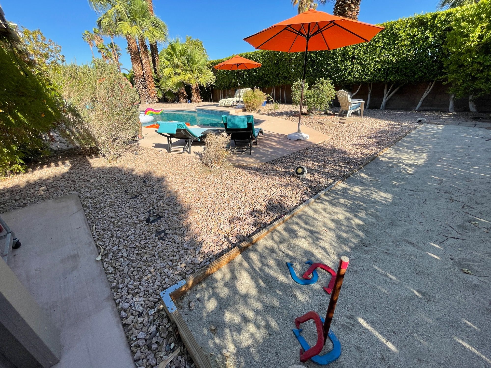 We love the pool and the in-ground hot tub attached. Take in the incredible mountain view, play on the horseshoe court, have a barbecue, splash around, or read and relax in the shade! Our patio has umbrellas and a large covered area so even in the sunniest parts of the day, guests can always find some shade. No lifeguard on duty!